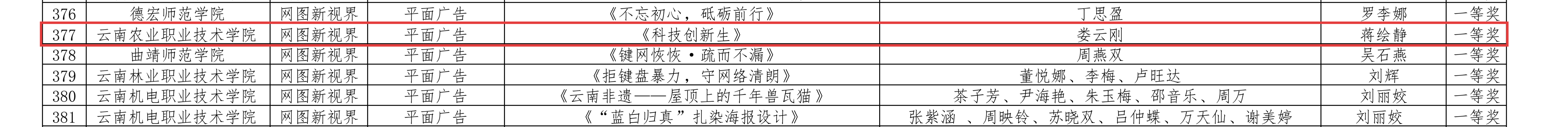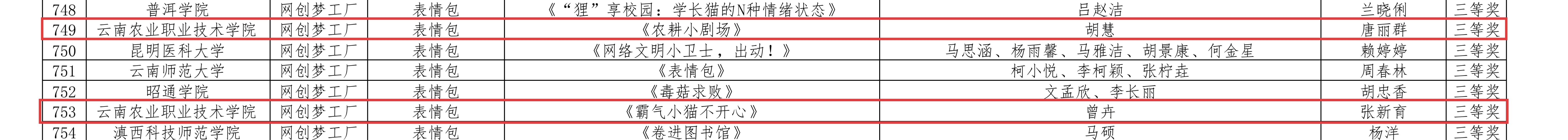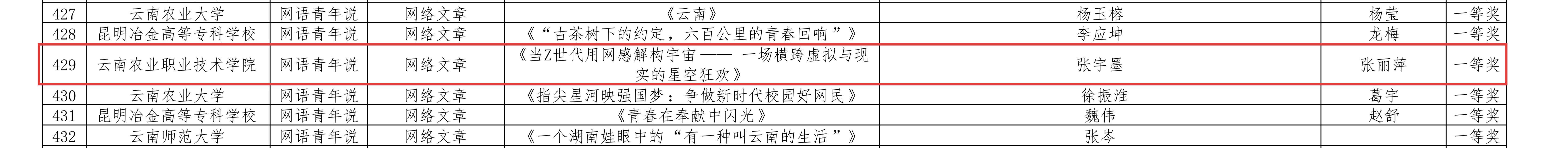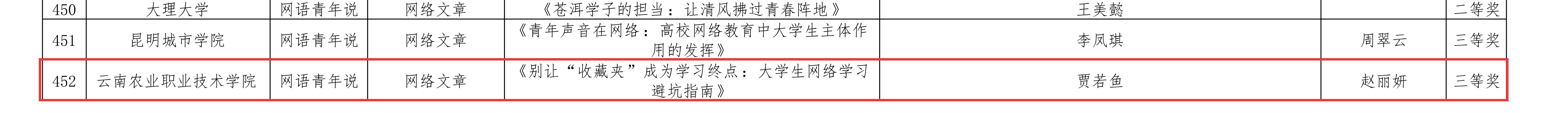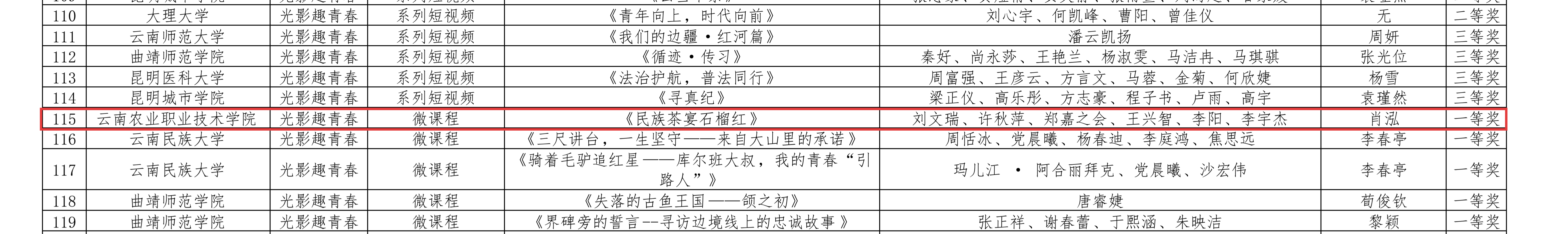 在第八届云南省大学生网络文化节作品学生组比赛中获奖作品共计15件。光影趣青春板块,刘文瑞、许秋萍等同学的微课程《民族茶宴石榴红》获一等奖,王安理、罗忠涛等同学创作的微视频《脚印落在乡村振兴的路上》获二等奖。影像创意汇赛场,张榕、周天胜等同学创作的公益广告(视频)《向云南》摘得一等奖。网图新视界板块,娄云刚同学创作的平面广告《科技创新生》获一等奖;康逸雪、依腊空等同学创作的漫画《争做校园好网民,共筑网络正能量长城》,王安理同学创作的摄影作品《花事未央》均获二等奖。网语青年说板块,张宇墨同学的网络文章《当Z世代用网感解构宇宙 ——一场横跨虚拟与现实的星空狂欢》获一等奖,贾若鱼同学的《别让“收藏夹”成为学习终点:大学生网络学习避坑指南》获三等奖;网络文学赛道中,王喆同学的《七天》、胡进丽同学的《聚光校园网:从“好网民”到“强国力”》均获二等奖。校园好声音板块,沙春蕊同学的校园歌曲作品《网聚微光,燃向远方》、王裕盈同学的《还有梦想(热血逐梦版)改编歌曲》均获三等奖。网创梦工厂板块,李金峰同学的微信推文《耕道养德青春志 网聚能量新征程》、胡慧同学的表情包《农耕小剧场》、曾卉同学的《霸气小猫不开心》均获三等奖。