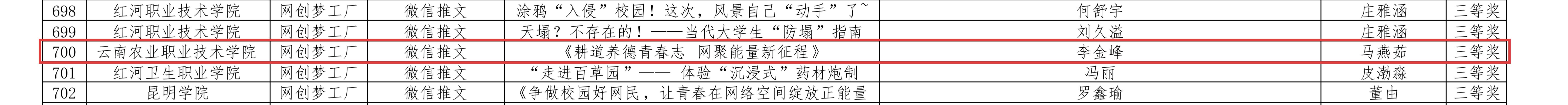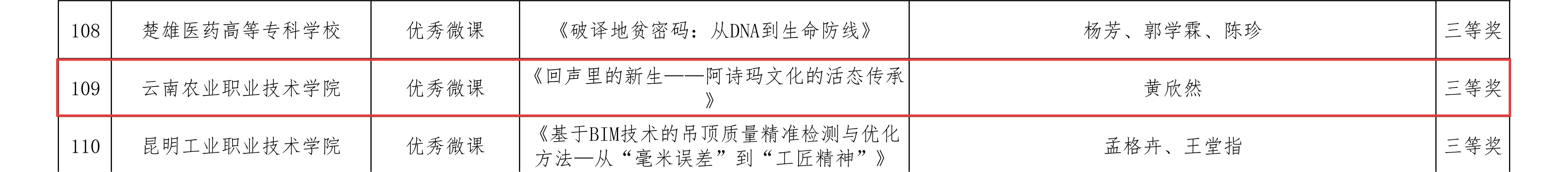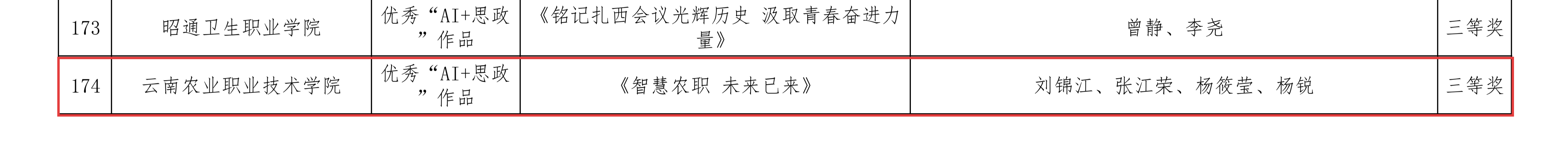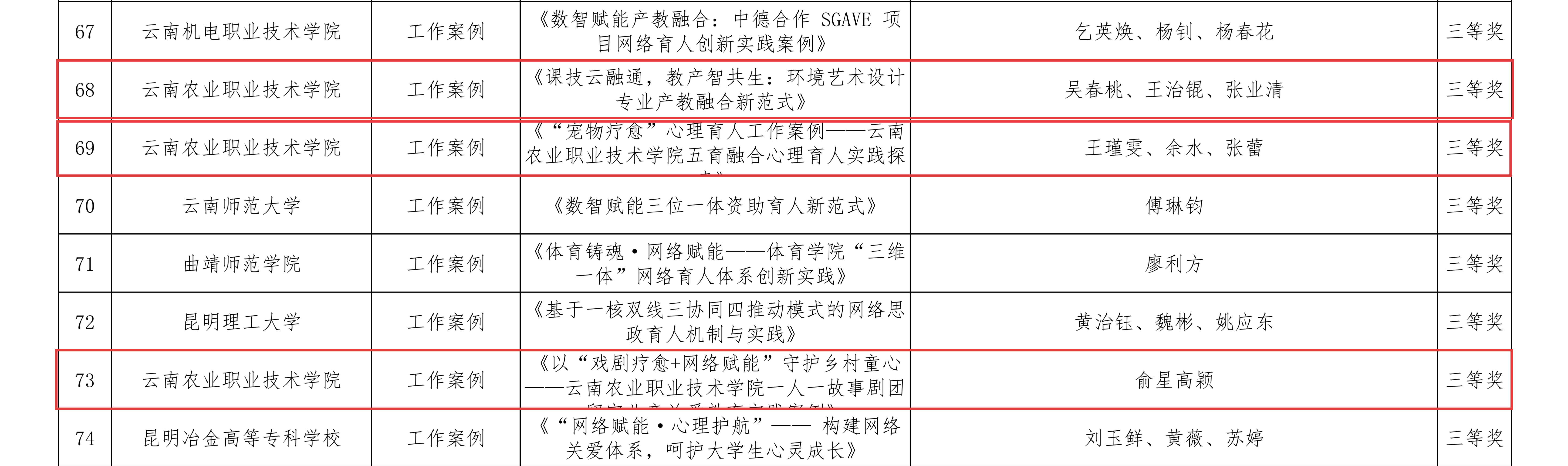 在第八届云南省大学生网络文化节和高校网络教育作品教师组比赛中,获奖作品共计8件。其中,张敏老师的优秀网络文章《保明伟——从青涩学子到亚洲象守护者的26年蜕变》获二等奖,黄欣然老师的优秀微课《回声里的新生——阿诗玛文化的活态传承》获三等奖;杨筱莹、唐丽群等老师联合创作的《师恩如光》,唐丽群老师创作的《稻花香里说丰年》均获优秀新媒体作品三等奖;刘锦江、张江荣等老师的优秀“AI+思政”作品《智慧农职 未来已来》获三等奖。吴春桃、王治锟等老师的工作案例《课技云融通,教产智共生:环境艺术设计专业产教融合新范式》,王瑾雯、余水等老师的工作案例《“宠物疗愈”心理育人工作案例——伟德BV1946官网五育融合心理育人实践探索》,俞星高颖老师的工作案例《以“戏剧疗愈+网络赋能”守护乡村童心——伟德BV1946官网一人一故事剧团留守儿童关爱教育实践》均获三等奖。