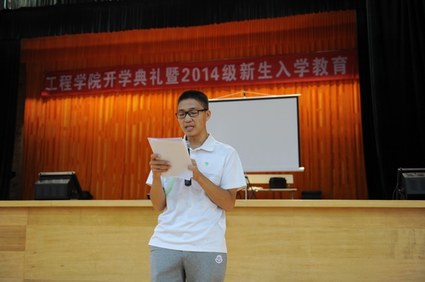 2014级工程造价三班的江思宏同学代表全体新生发言。他表示新校园新起点,在未来三年的时光里,将以先贤为坐标,牢记领导、老师和父母的殷切希望,尽快适应新的大学生活,树立远大的目标,努力提高自己的综合素质,熟练掌握专业知识。