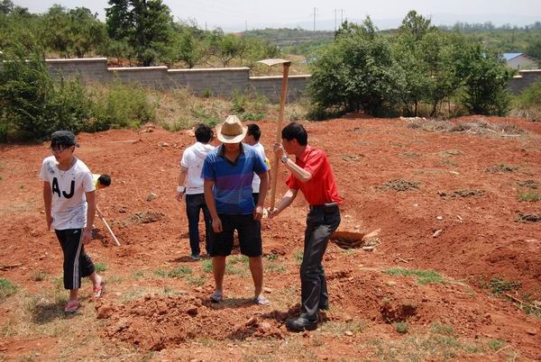 中午12点40分,老师们与参加植树学生向农牧场进发。烈日炎炎,抵挡不住老师同学的热情。老师们亲身示范,同学们积极实践。老师与学生进行自由组合,80多名师生分成30多个小组,为100棵树苗种植做好准备。短短1个小时,100棵树苗的坑位已经按照50公分乘50公分的规格挖好。下午,树苗运达农牧场,师生们顶着烈日,排成长队,团结一心,如火如荼地进行树苗的卸载。各小组分别把树苗种入各自挖好的坑中。由于农牧场缺水,让树苗成活成了一大难题。但同学们勇于克服困难,用盆用桶抬水提水为树苗进行浇灌。晚六点半,为期一天的植树活动终于落下帷幕。四个教研室党支部学生党员自愿每周轮班浇水施肥,以保证树苗在干旱缺水的状态下成活。