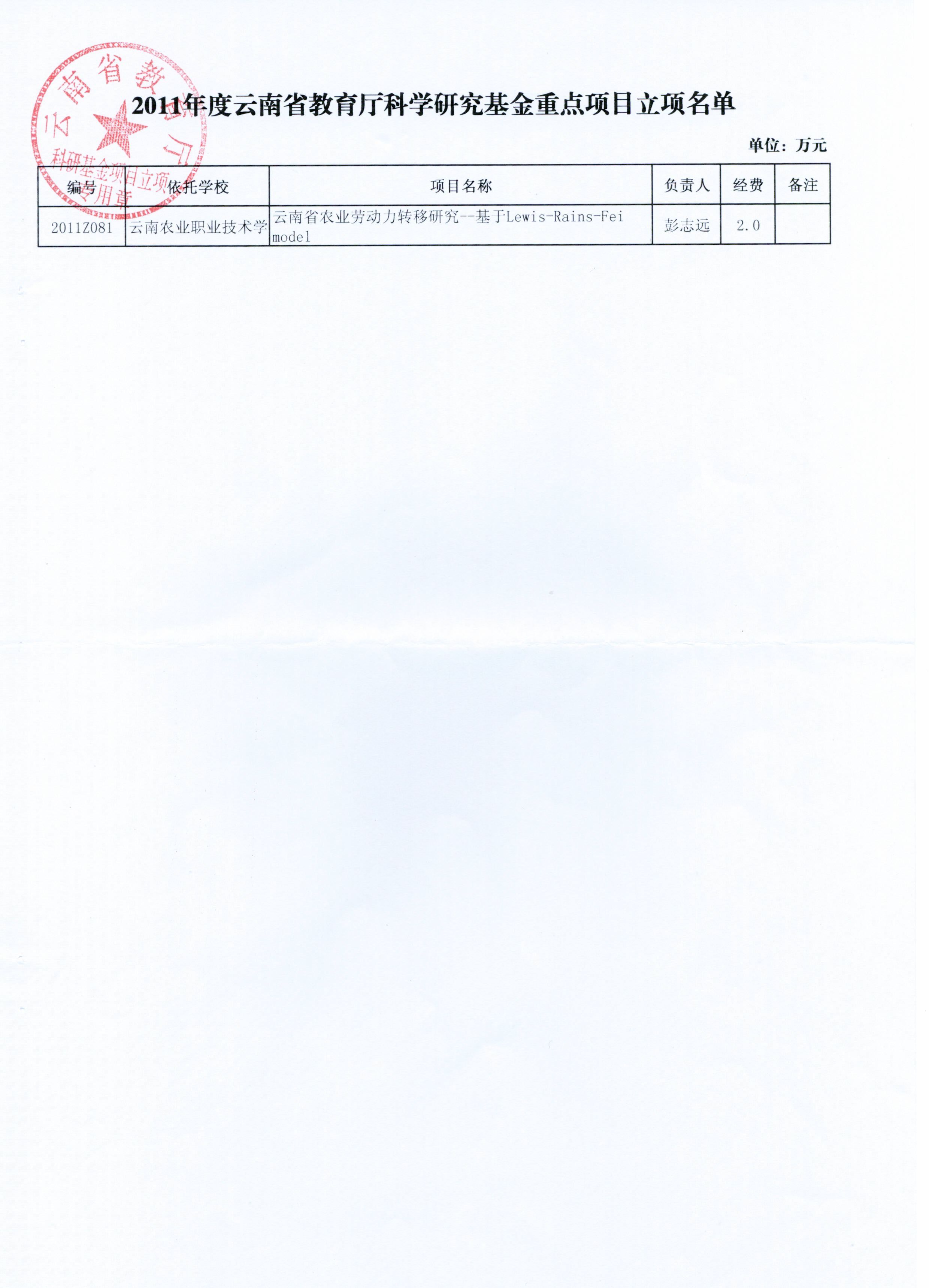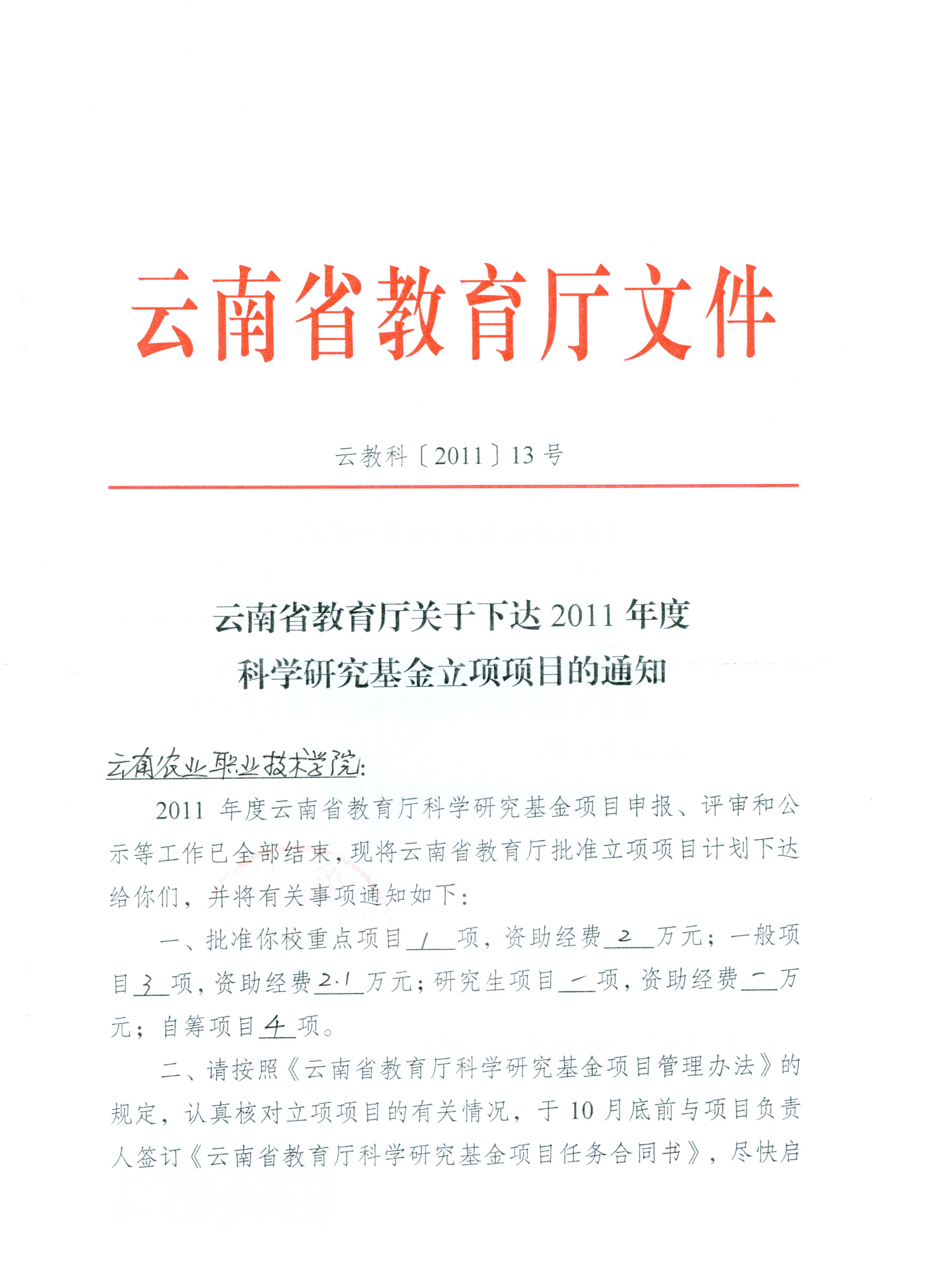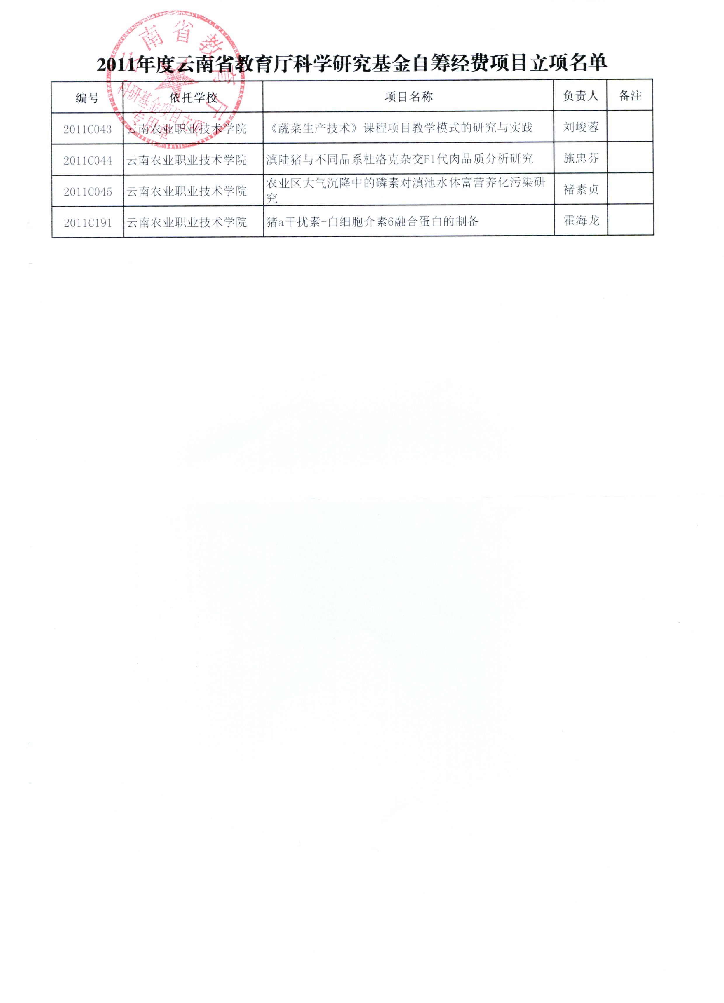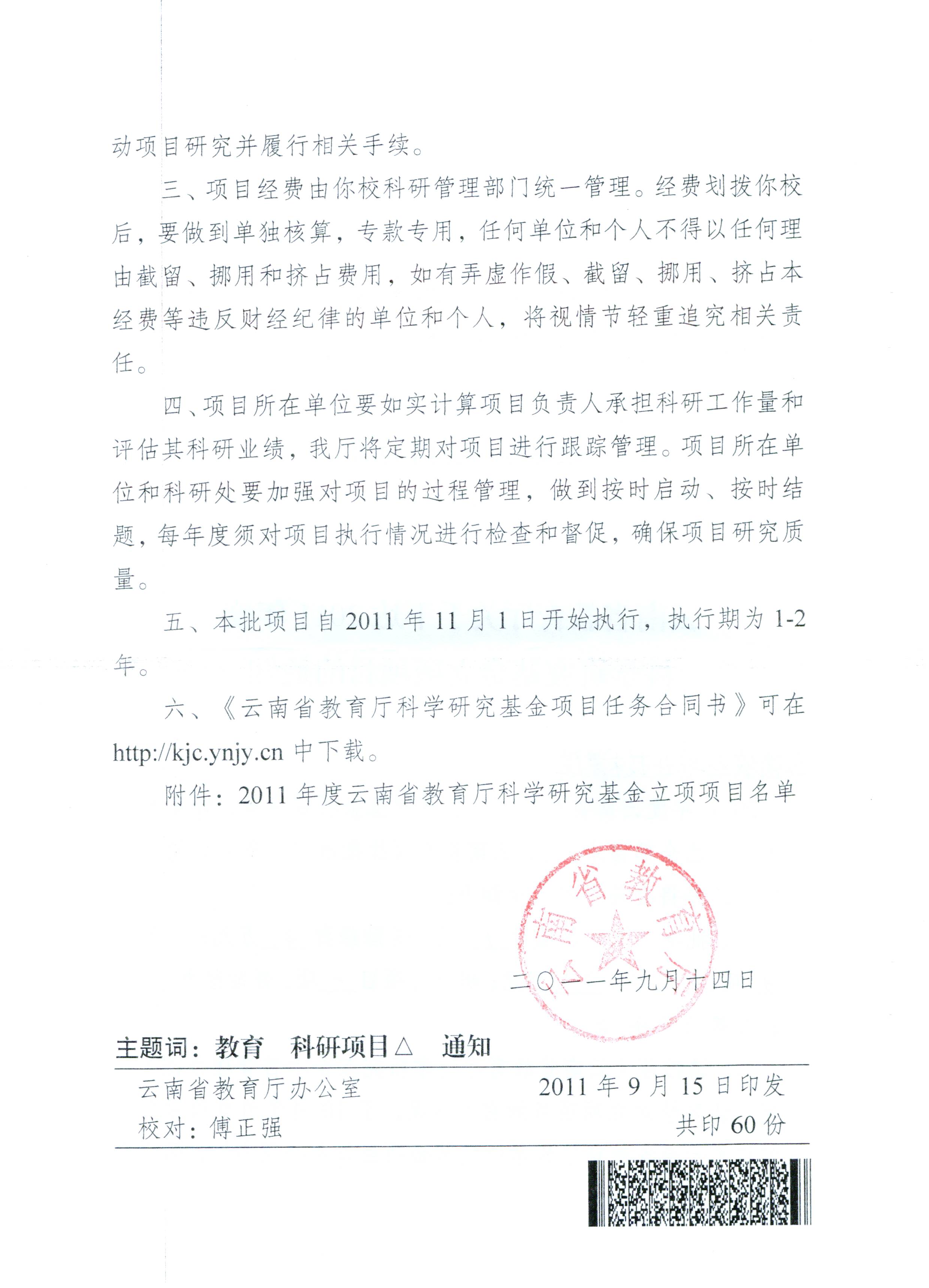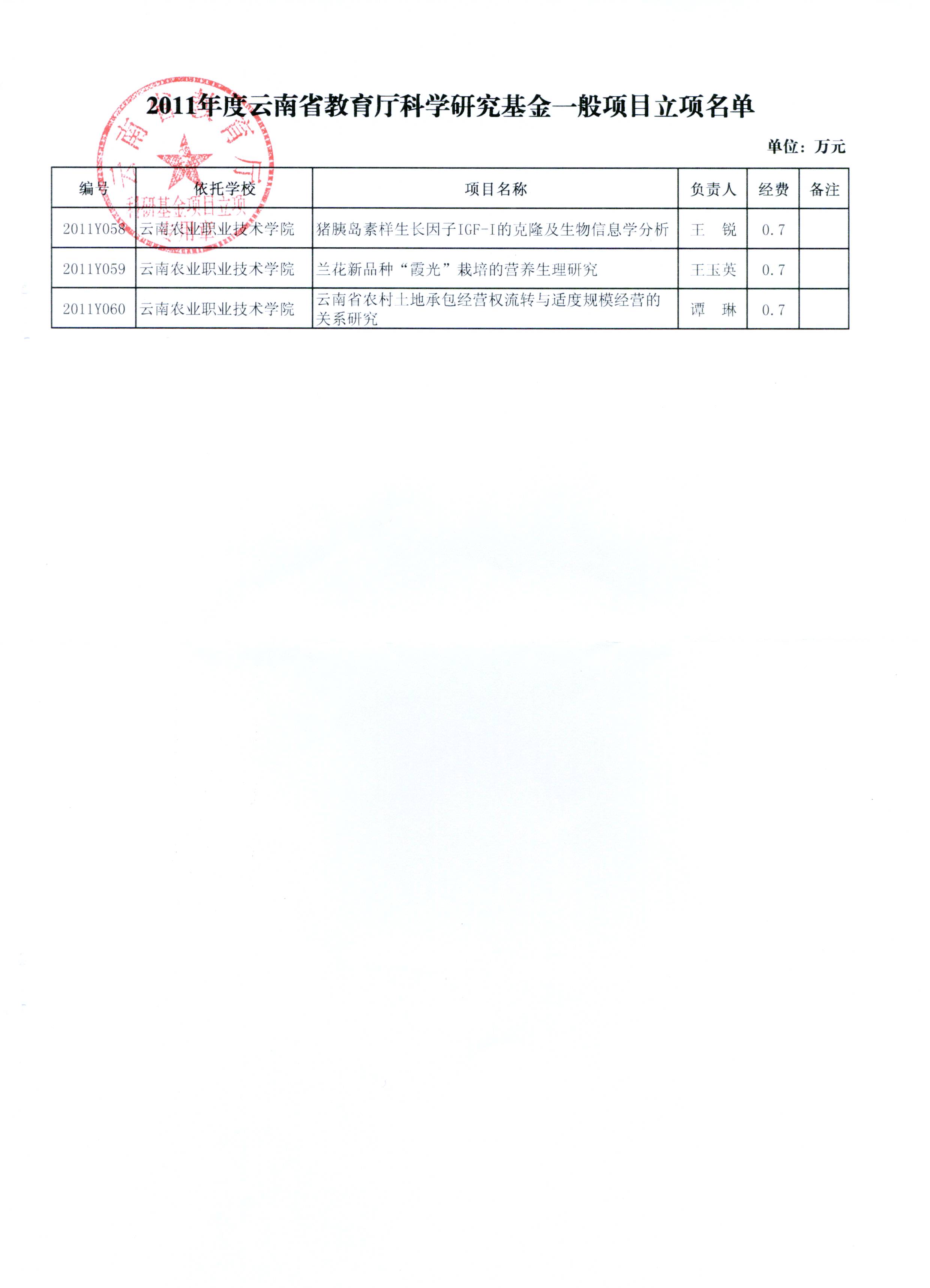 据云南省教育厅《云南省教育厅关于下达2011年度科学研究基金立项项目的通知》(云教科