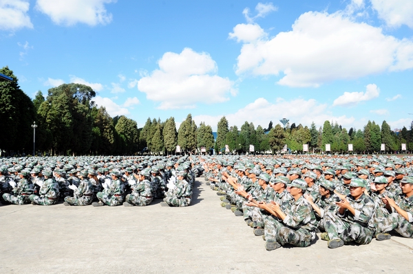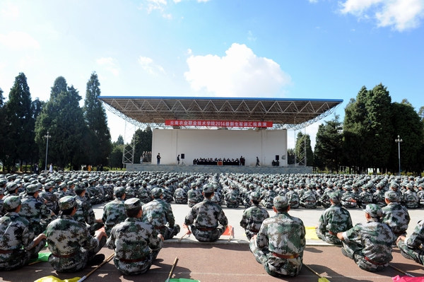 党委书记、军训团政委崔金赋为本次新生军训作了总结讲话。崔书记说,历时两周的2014级军训工作胜利结束,他代表学院党委向承担本次军训工作的中国人民解放军昆明民族干部培训学院领导和官兵致以崇高的敬意!向参与组织这次军训的学院各部门、各二级学院领导、辅导员和带队老师表示亲切的慰问!向圆满完成各项军训任务的2014级全体同学表示热烈的祝贺!他指出,同学们精神振奋、动作规范、队形整齐、气势雄壮,展示了伟德官网大学生的青春风貌。通过这次军训,全体2014级新生坚定了爱国主义信念、培养了集体主义精神,增强了国防意识,磨炼了意志、强健了体魄,提升了综合素质。崔书记对同学们今后的学习生活提出了三点希望:一是希望同学们保持军训中的良好习惯,高标准,严要求,规范自己的言行;二是希望同学们发扬部队的优良传统和作风,严于律己,强化集体观念,做文明学生,共创文明校园;三是希望同学们感受军人爱国之情,培养正确的世界观、认识观和价值观,树立远大理想,大力弘扬“耕道、养德、理想、开拓”的校训精神,勇往直前,百折不挠。