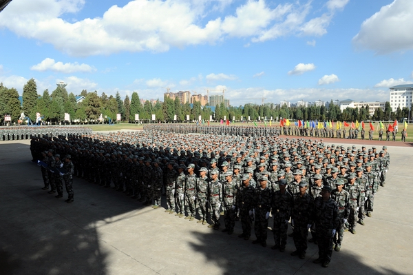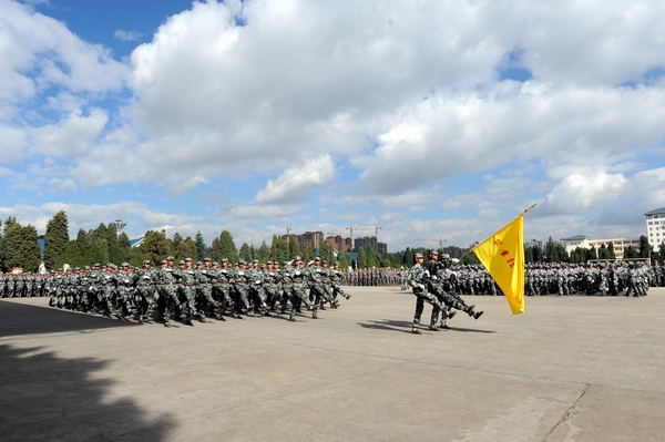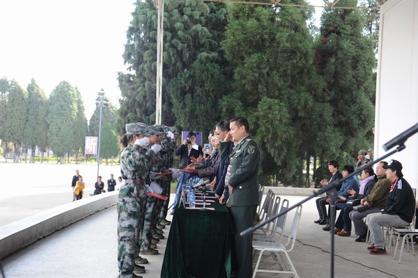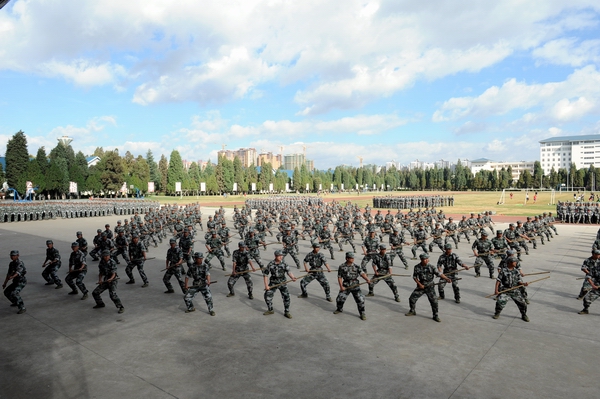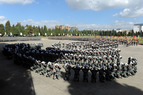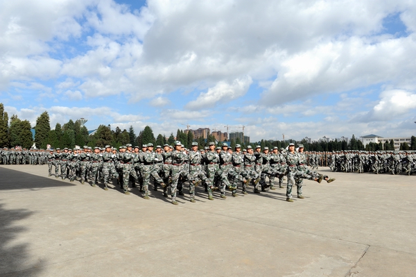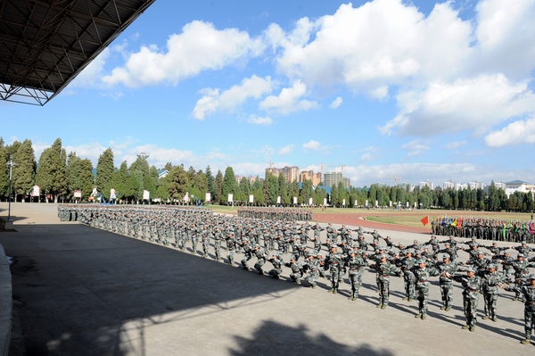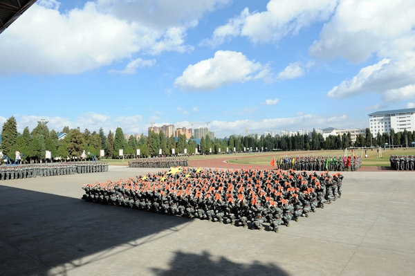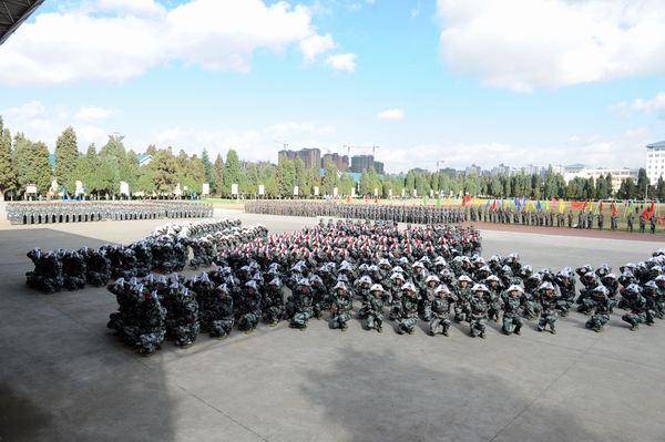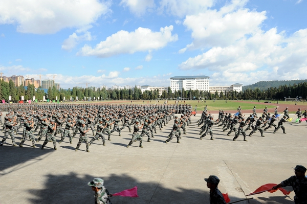 伴着深秋的落叶彩旗飘飘,随着铿锵的锣鼓胸怀激荡。洪亮的口号响彻云天,踏着有力步伐的队伍迎面而来。2013年11月9日上午10:00,伟德官网2014级新生军训汇报表演暨总结表彰大会在昆明民族干部学院检阅台隆重举行。