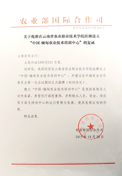 《关于批准在云南省农业职业技术学院挂牌设立“中国-缅甸农业技术培训中心”的复函》