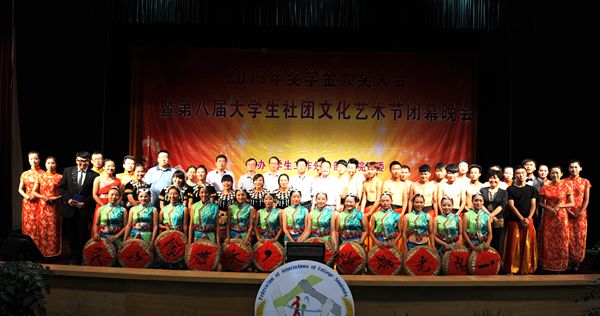 颁奖典礼暨第八届大学生社团文化艺术节闭幕式文艺表演结束后,学校领导、中层干部与演职人员合影留念。