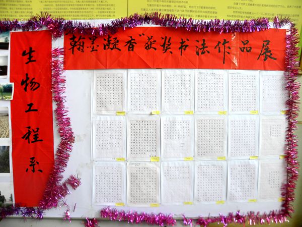 这次书法大赛让同学们认识到书写规范、优美的汉字是每一个中国人都应该做到的,特别是当代大学生更应该率先垂范。比赛也为书写规范的同学提供了一个展示的平台,有利于促进院系学风建设。(生物工程系供稿)